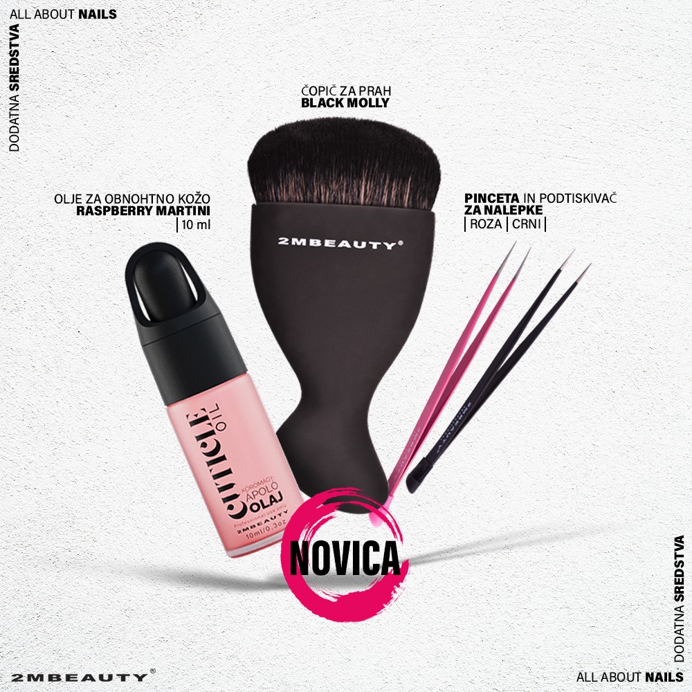 Za popolno negovane nohte je tu novo olje Raspberry martini z vonjem koktejla in polno vitaminov. Zamenjajte svojo staro ščetkico za prah, z novo Black Molly ščetko atraktivnega videza in olepšajte svojo delovno mizo. Za enostavnejši nanos nalepk za nohte, izkoristite našo posebno pinceto, katero najdete v črni ter pink barvi.