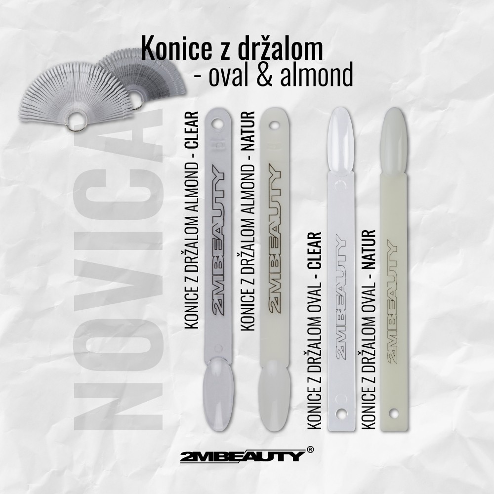 Za konec smo pustili 2 vrste novih konic z držalom. Nanesite nove barve na konice, sedaj tako popularne mandeljeve ali ovalne oblike ter prikažite svojo barvno paleto na zelo privlačen način.