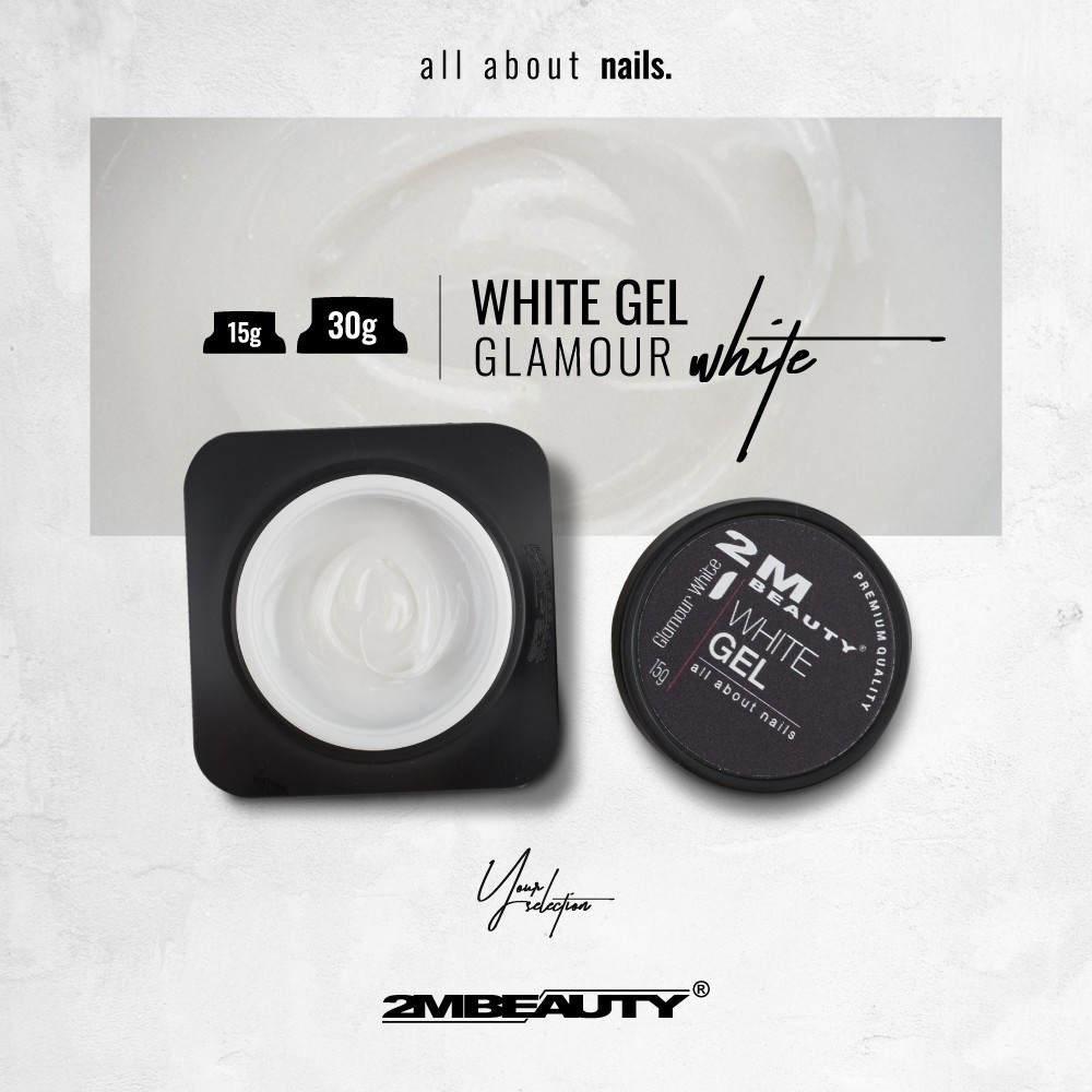 Mlečna belina, z veliko drobnih svetlikajočih delcev? Da,to je Glamour white. Kakor samo ime pove, glamurizno bel gel. Lahko ga uporabljate za Baby boomer, čez celoten noht ali za kreiranje snežnega efekta. Ima nežen, diskreten, svetlikajoč efekt ter nežno prekrije belo barvo.