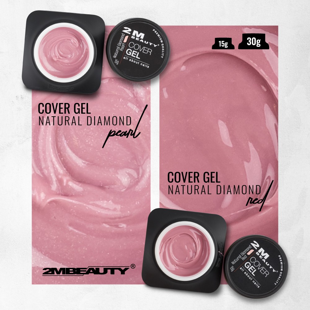 Dve različice svetlikajočega Cover gela so Natural diamond pearl in Natural diamond red gel. Oba gela imata prelepo kamuflažno barvo, ter se uporabljata za podaljševanje naravnega nohta. Osnovna razlika je v barvi diamantnih bleščic. Pearl vsebuje bleščice srebrne barve, Red pa bleščice v pink barvi. Izberite Vam najbolj simpatičnega, ter zasijte dijamantnim leskom.