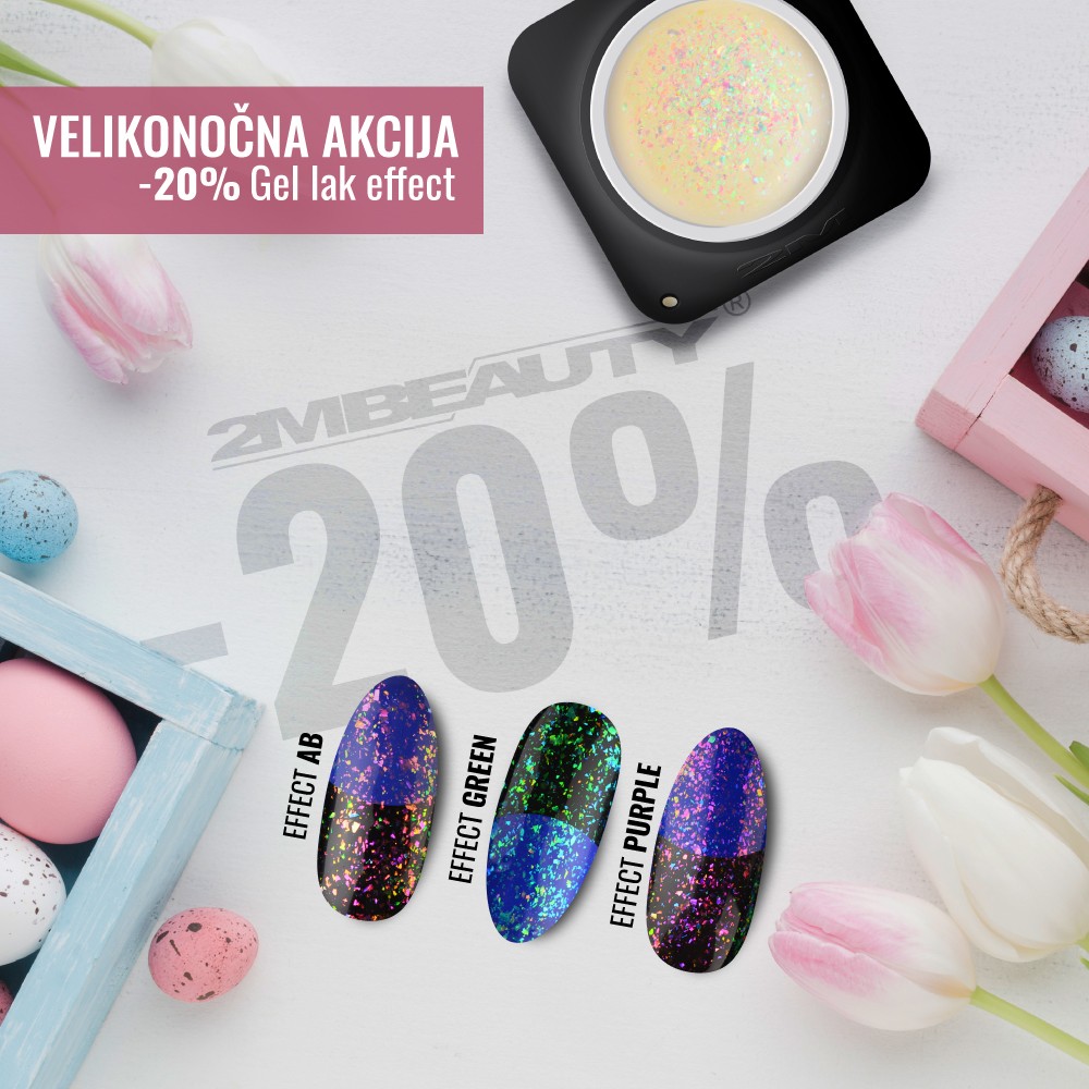 Ob velikonočnih praznikih smo za vas pripravili zelo lepo in zanimivo akcijo. Pripravite se na pomlad, napolnite zaloge in delo se lahko prične! Effect geli so prozorni gel laki z dodatkom svetlečih lističev folije. Izgledajo prelepo na pastelnih barvah ali kot okras na delu nohta. Sedaj so z 20% popustom.