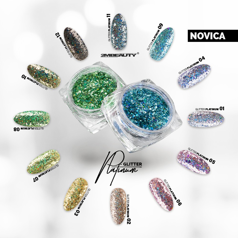Mix glitter in flitter različnih velikosti. Uporabite jih lahko tako, da jih vgradite v gel ali posipate po površini zaključnega sijaja. Imajo izjemno sijočo moč.