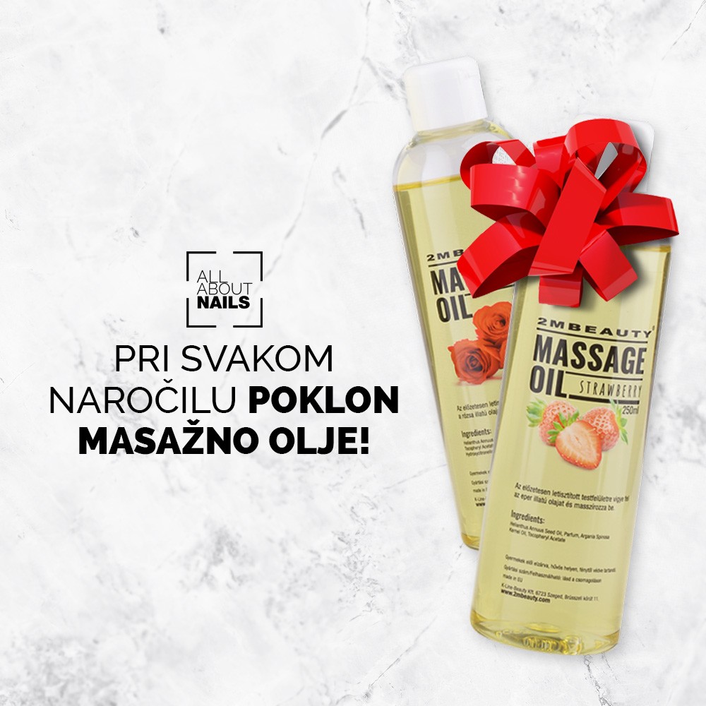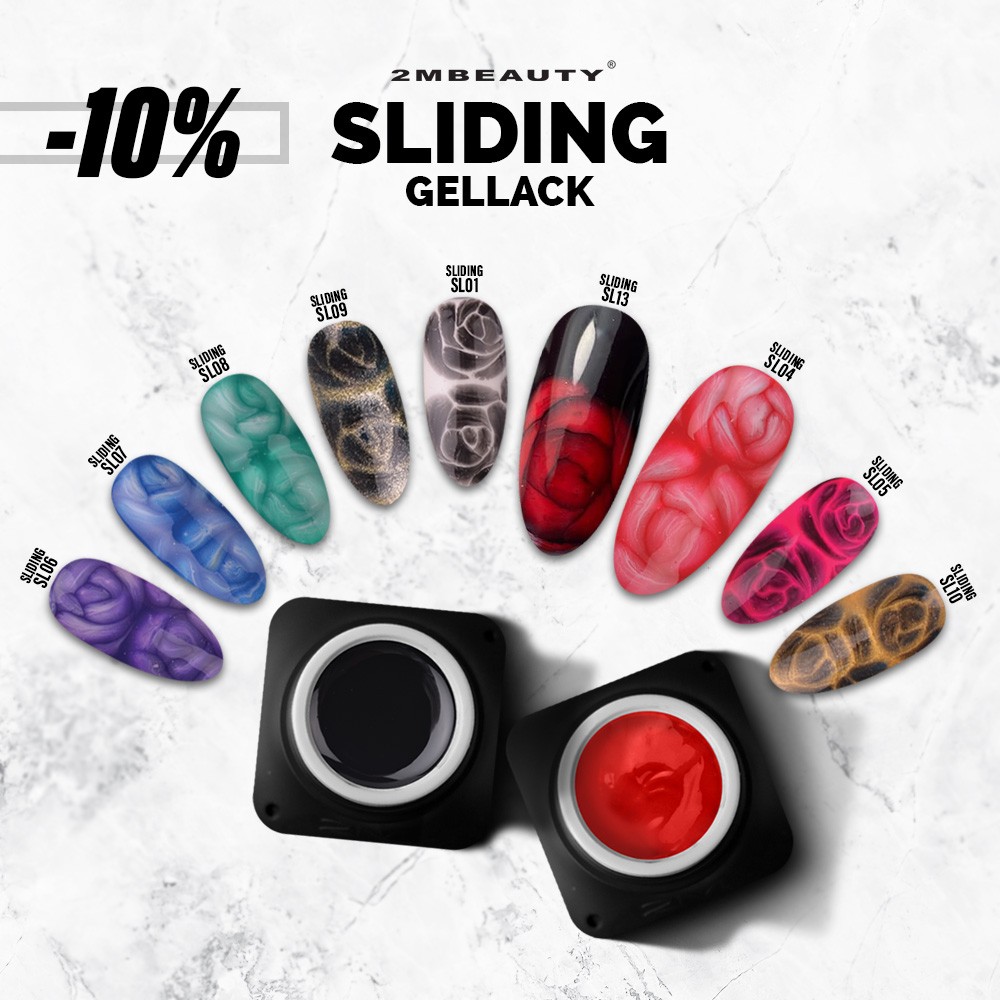 Za konec pa nekaj zelo zanimivega in unikatnega: Sliding gel lak. Ta gel lak ima sposobnost razlivanja. Uporaba je enostavna: Nanesite željeno barvo na nohte ter jih posušite v lučki. Po tem nanesite Sliding gel lak in ga ne sušite, temveč na njega z bilo katerim lakom nanesite motiv. Motiv se bo začel razlivat na Sliding gel laku. Ko ste dobili želen izgled nohte posušite v lučki, za konec pa zaključni top. Sliding gel sedaj lahko dobite znižan za 10%.